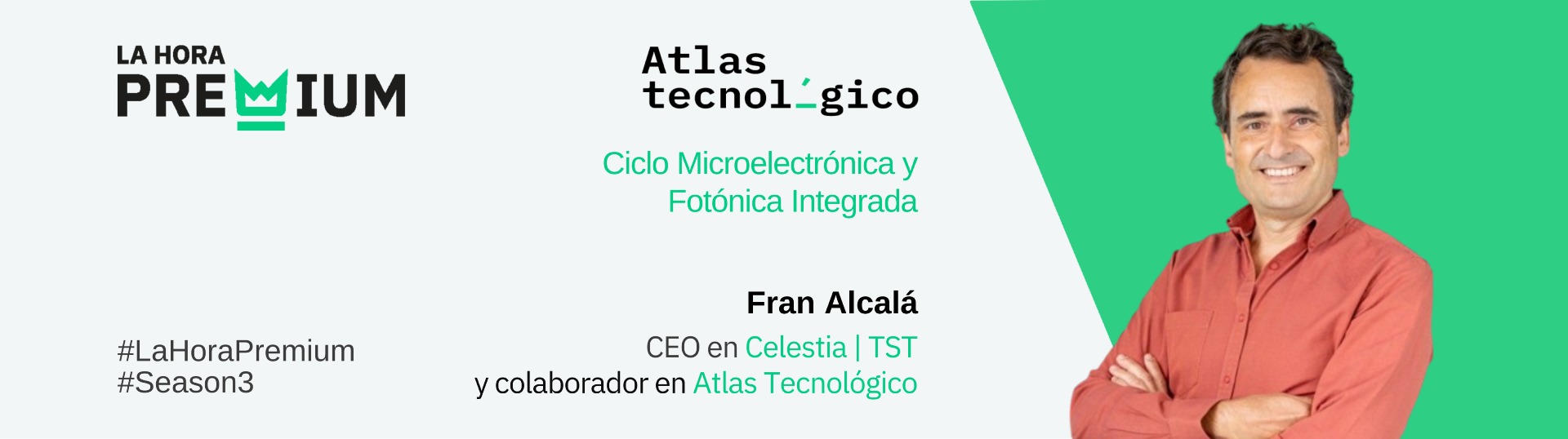Francisco Alcalá Galán, CEO de Celestia | TST y colaborador en Atlas Tecnológico, protagoniza la sesión de 'La Hora Premium', correspondiente al Ciclo de Microelectrónica y Fotónica Integrada, titulada "Panorámica del estado del arte de la industria microelectrónica"
