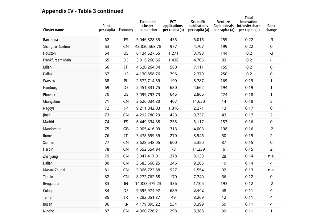 Según el informe, Barcelona ocuparía el puesto 62 a nivel internacional y Madrid el puesto 74 en la ‘Top 100 innovation clusters, 2025’. Barcelona registró 435 patentes frente a las 255 de Madrid en el último año y también aventajó a la capital en acuerdos de capital de riesgo (259 frente a 157), hecho que demuestra que el ecosistema emprendedor barcelonés atrae más financiación para startups. En el ámbito académico, Madrid superó por la mínima con 6.117 publicaciones científicas frente a 6.016 de Barcelona.