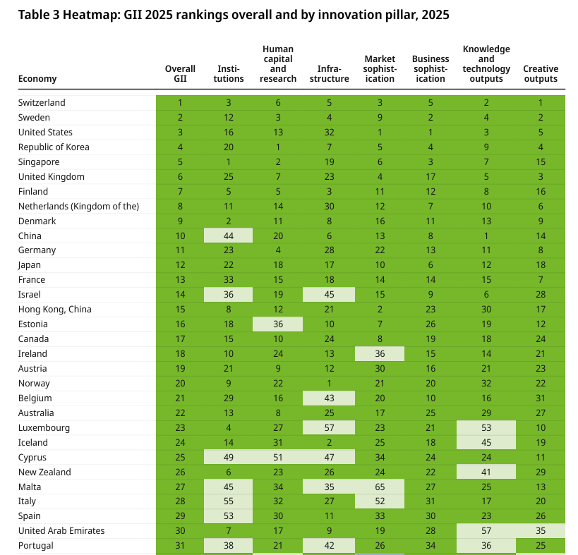 El GII 2025 confirma que Suiza es por decimocuarto año consecutivo el país más innovador del mundo, seguida por Suecia y Estados Unidos. Corea del Sur alcanza un histórico cuarto puesto y Singapur cierra el Top 5.