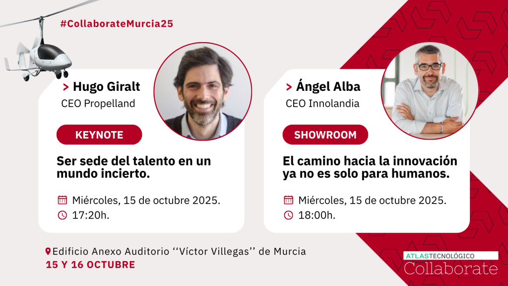 El Collaborate Murcia comienza a desvelar su agenda. Tras las visitas a empresas, Hugo Giralt (CEO de Propelland) y Ángel Alba (CEO de Innolandia) serán los protagonistas del arranque del evento. Giralt ofrecerá la keynote ‘Ser sede del talento en un mundo incierto’, y Alba compartirá el showroom ‘El camino hacia la innovación ya no es solo para humanos’. Durante las próximas semanas, Atlas Tecnológico continuará anunciando el cartel de ponentes y actividades de un Collaborate que promete sorprender y que destacará la importancia de ‘ser sede’ del talento y la industria.