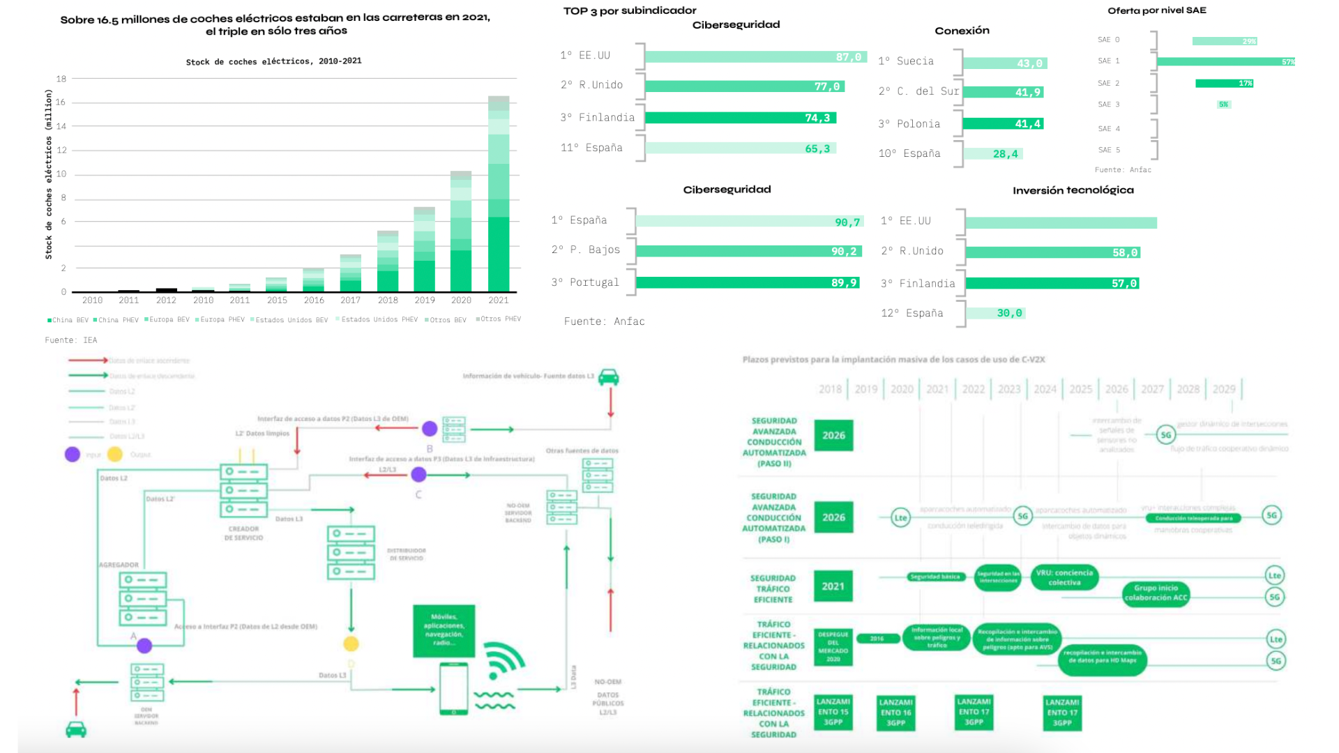 Las vías interurbanas en España cuentan con más de 13.000 km de fibra óptica y están monitorizadas con cerca de 10.000 dispositivos (entre cámaras, lectores de matrículas, aforadores y estaciones meteorológicas). El proyecto DGT 3.0 Plataforma de Vehículos Conectados tiene como objetivo proporcionar datos anonimizados, en tiempo real y contextualizados para interconectar el ecosistema de movilidad. Junto a él, iniciativas como el proyecto Aivia de Ferrovial, Microsoft, 3M y Kapsch TrafficCom, tras una primera fase (2020 a 2022) de mejora de la infraestructura física de los distintos corredores mediante sensorización, prevé ir incorporando hasta 2026 tareas más complejas, como la carga en carretera, la prioridad del transporte público, el acceso a vehículos compartidos o la disposición de carriles de emergencia virtuales.
