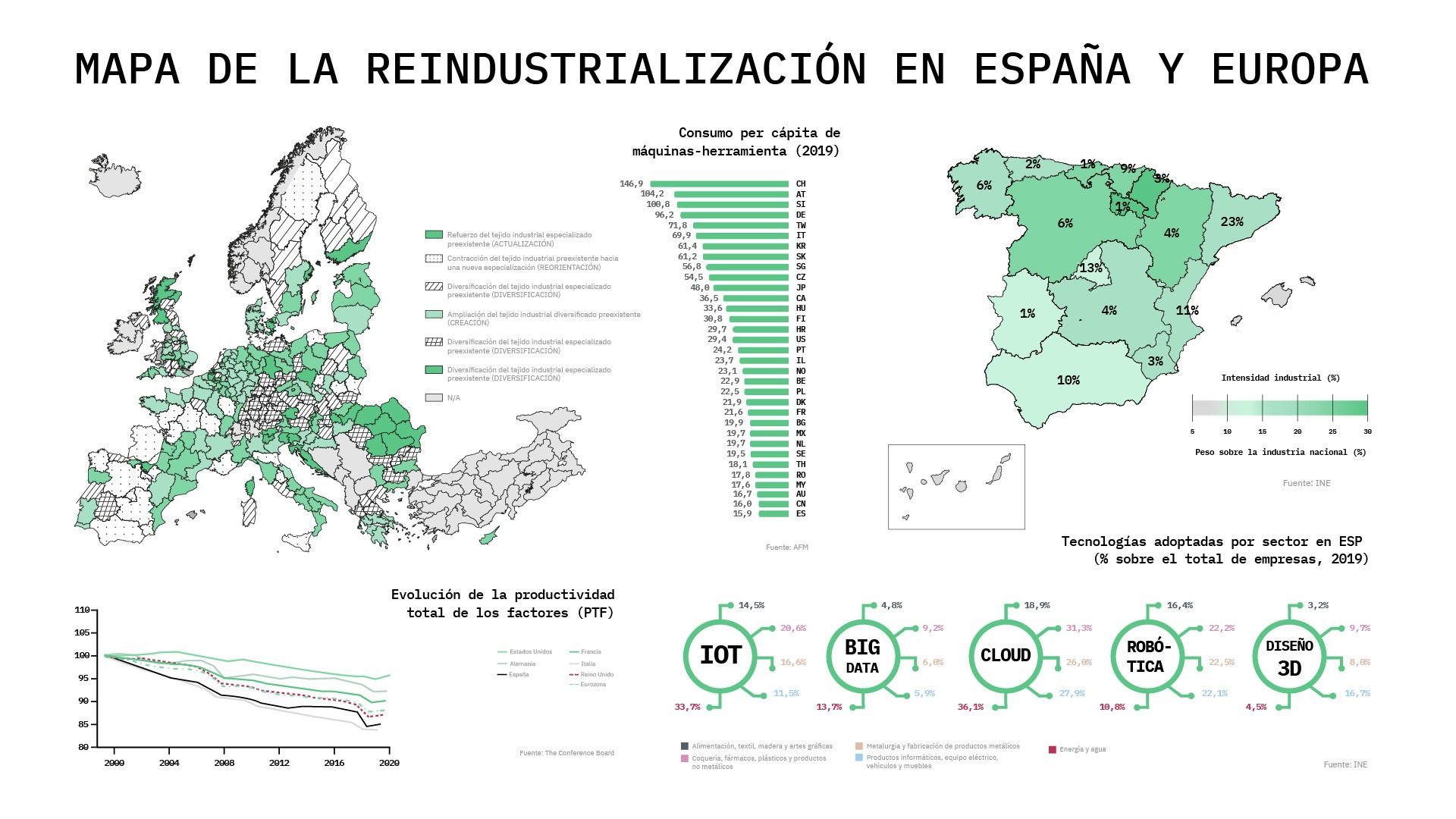 El trabajo sostiene que, incluso partiendo de condiciones estructurales iniciales similares, las regiones pueden terminar en diferentes vías de desarrollo, debido, por ejemplo, al espíritu empresarial innovador local, al espíritu institucional local y al liderazgo basado en el lugar. De nuevo, la gobernanza. Dentro de las regiones en reindustrialización, las que refuerzan el tejido industrial especializado preexistente son las que van acompañadas de mayores ganancias de productividad. Frente a la idea europea de que la reindustrialización debe tener lugar especialmente en los sectores manufactureros avanzados, las investigadoras creen que esta no es necesariamente la mejor manera de proceder, porque la clave del éxito no reside realmente en el sector escogido. "Lo que es importante, en cambio, es que un proceso de modernización acompañe a la reindustrialización".