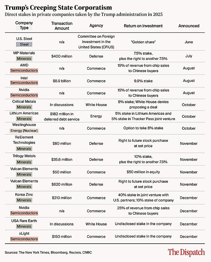 El año en que Estados Unidos se volvió (un poco) socialista El Gobierno de Estados Unidos no había tomado una participación directa en una empresa comercial saludable desde al menos la década de 1950. En 2025, ha entrado en el capital de 14 compañías, y hay más en camino. Según Scott Lincicome, vicepresidente de economía general y del Centro Herbert A. Stiefel de Estudios de Política Comercial de Catos Institute, es posible que sean estas medidas (no los aranceles de Trump, ni las redadas de deportación del ICE, ni DOGE, ni la “One Big Beautiful Bill”, ni ninguna otra cosa) las que acaben resulten ser el legado “más importante e ignominioso” de 2025.
