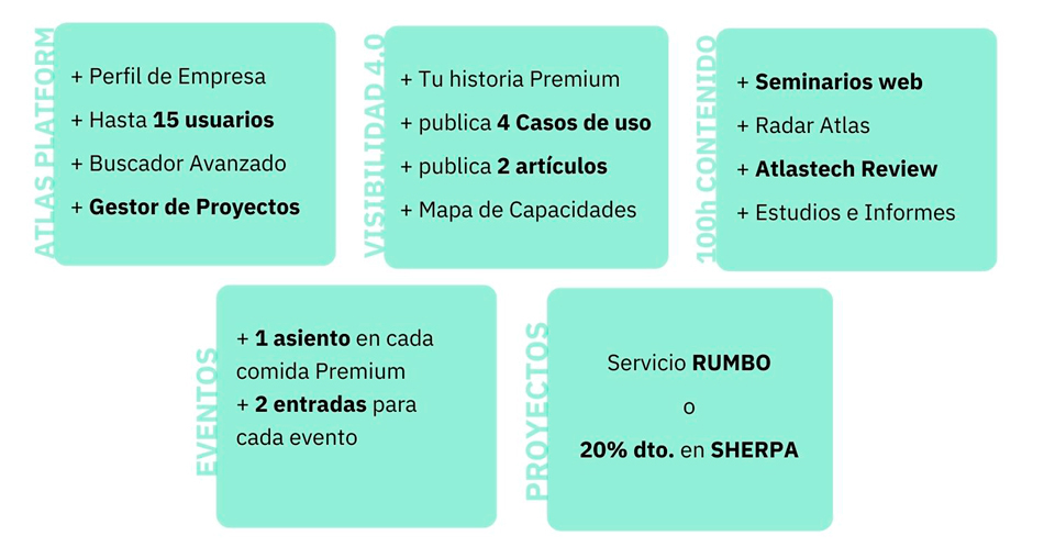 Acceso ilimitado a formaciones especializadas y a los informes Atlas Tecnológico, descuentos especiales en eventos, comidas Premium con ejecutivos industriales y tecnológicos y búsquedas avanzadas en el mapa de capacidades.