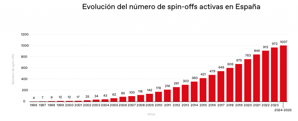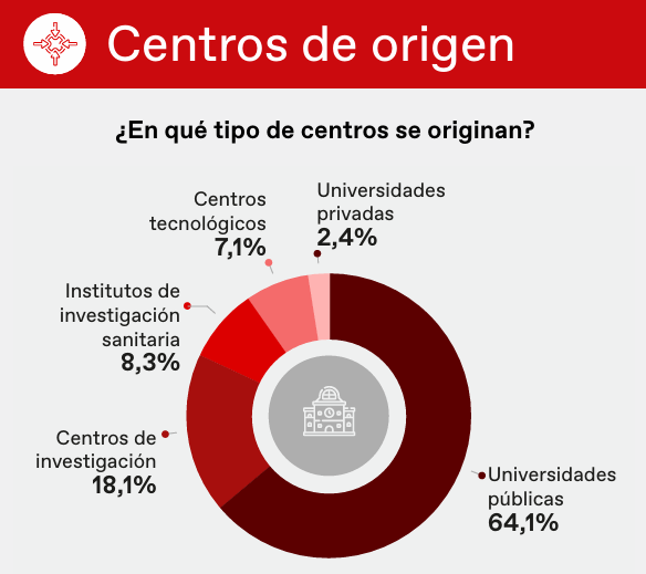 Las universidades públicas lideran la incubación de spin-offs, responsables de más del 66% del total. La Universidad Politécnica de Madrid y el CSIC encabezan la lista, seguidos por la Universitat Politècnica de Catalunya, la Universidad de Alicante y la Universidad de Santiago de Compostela.