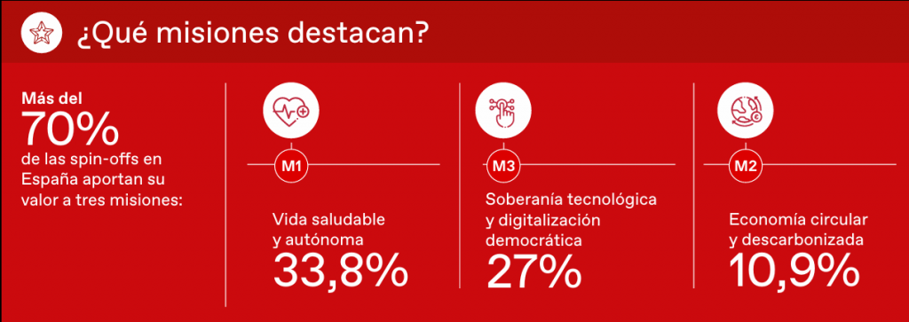 Una de las grandes novedades del informe es la introducción de una taxonomía misional, que clasifica a las spin-offs según su contribución a ocho grandes misiones de país: Vida saludable y autónoma, Economía circular y descarbonizada, Soberanía tecnológica y digitalización democrática, Alimentación sostenible, Ciudades neutras y movilidad inteligente, Cohesión social, Restauración del planeta vivo y Seguridad estratégica. Más del 70% de las spin-offs se alinean con tres misiones principales: Vida saludable y autónoma (33,8%), Soberanía tecnológica (27%) y Economía circular (10,9%). La nueva generación de spin-offs, surgida desde 2024, comienza a abordar misiones emergentes como ciudades climáticamente neutras o restauración ambiental.
